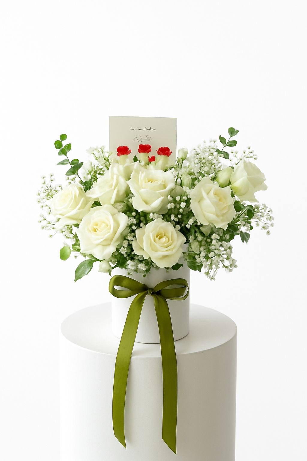 A stunning medley of lavender and white roses, delicately intertwined with tiny baby’s breath flowers. The soft hues create an ethereal, dreamlike aesthetic, while the intricate details bring an air of refinement. A truly enchanting floral arrangement that speaks of love and grace.